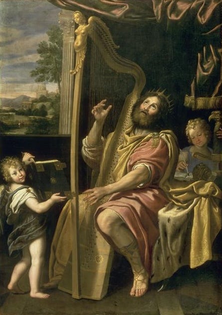 The title track of Dave’s album doesn’t feature the sound of a harp, but the lyrics refer again to David’s performance for Saul and for God, the same one Leonard Cohen alluded to in ‘Hallelujah’. On Dave’s song, as elsewhere on the LP, piano seeps through. Echoes of Satie. In this year when Ian Penman’s book on Satie had me listening to hours of the composer’s music, it all connects.