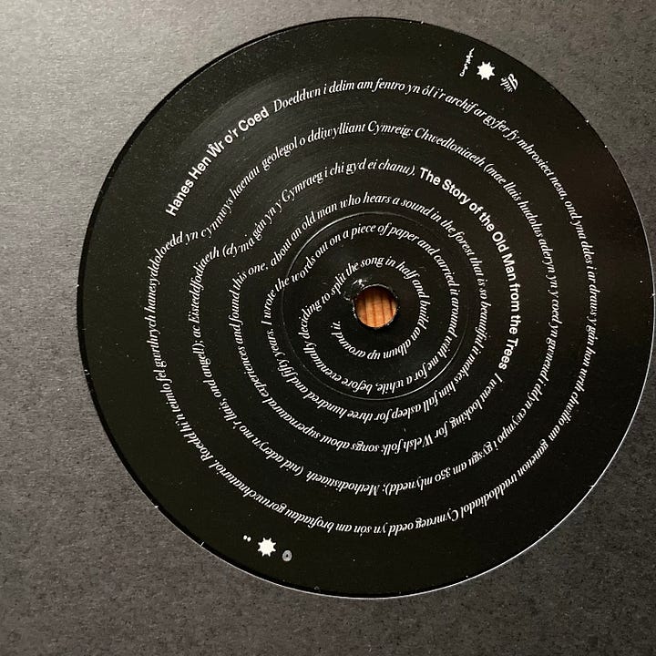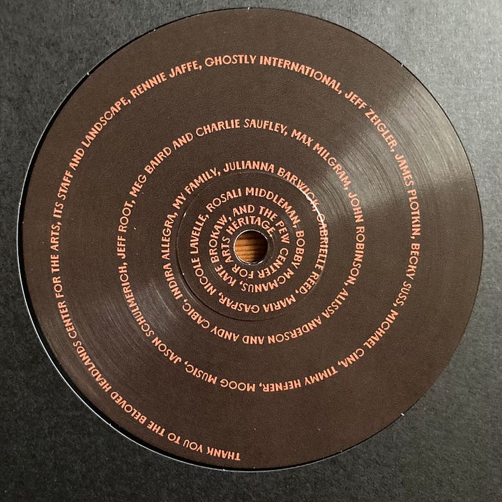 The record labels of Cerys Hafana’s Angel and Mary Lattimore’s Hundreds of Days have similar typographical designs. I probably wouldn’t have noticed were I not placing harp records together. It doesn’t really mean anything, but my mind goes wandering nonetheless. With Angel, I’d originally thought of tree rings, but these are spirals. Record grooves. Swirling water. Journeys inward and outward.
