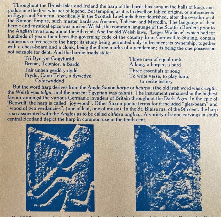 I have the first of Robin Williamson’s two Legacy of the Scottish Harpers LPs. The harpist as teacher. The album as pedagogy. Extensive liner notes on the harp’s history and the provenance of the fourteen tracks, with bibliography and glossary. Among the many things Williamson shares are the ‘numerous references to the harp’ in the old Welsh laws: ‘its study being permitted only to freemen; its ownership, together with a chess-board and a cloak, being the three marks of a gentleman; its being the one possession not seizable for debt’.