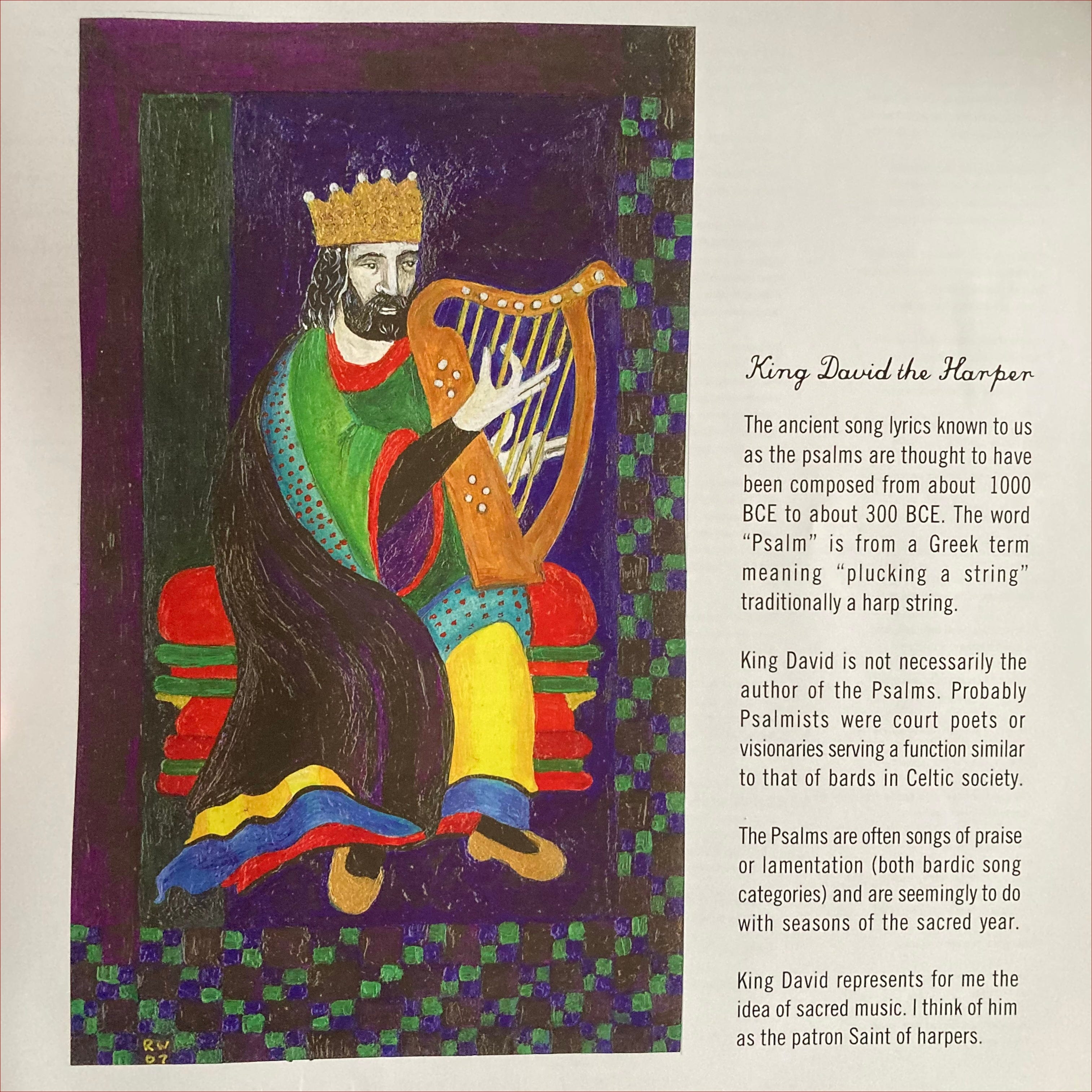 Robin Williamson’s Love Will Remain comes with a booklet of paintings, lyrics and notes. One of the paintings is King David the Harper.