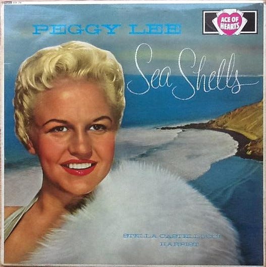 One seed for what became my Year of the Harp: the strange Peggy Lee album I bought in a charity shop in Truro in early January. Sea Shells (1958) finds Lee performing songs and reading translations of Chinese poems to the accompaniment of Stella Castellucci on harp and Gene Di Novi on harpsichord. ‘We used the harp in this album’, Lee writes in the liner notes, ‘to capture the mood of the sea—and because it’s just wonderful to sing with the harp’. The oceanic harp, songs as seashells found on the shore. Of Castellucci’s playing, Lee highlights ‘the lovely surf sounds and oriental flavour’. A nod, perhaps, to those exotica and mood music albums of the time, where harps abound to denote the celestial, the dreamy, the romantic, the ocean-lapped.